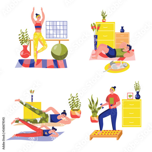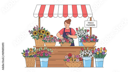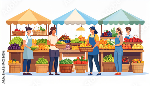 Pouliční stánek na trhu, prodavačka, dívka nakupující banány a čisticí prostředky, muž pohybující se vozík s hroznem, vektorové ilustrace. Bazar, ovoce a zelenina farmáři Market složení pro web banner atd.
