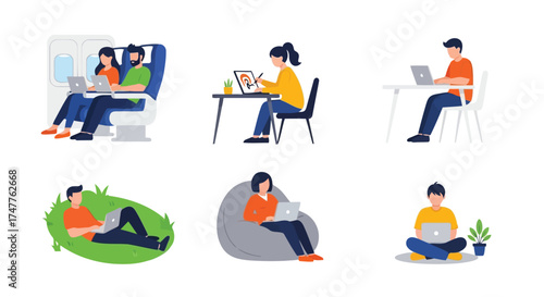 Farming coffee production stages flat vector scene set. Muž žena farmář vychystávání, nakládání do průmyslové mlýnek, sušení a pražení kávová zrna ilustrace