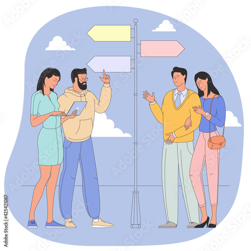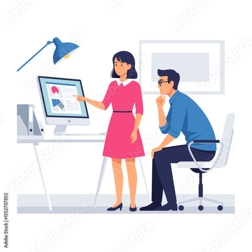 Módní stylista pracující s klientským vektorem. Konzultantka pomáhá ženě vybrat si oblečení, nové módní oblečení a osobní styl ilustrace. Nákupní a krejčovský pracovní prostor