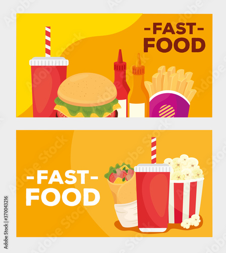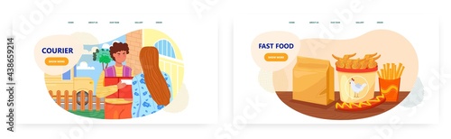 Fast food courier vstupní stránky design, webové stránky banner šablony set, ploché vektorové ilustrace. Male courier doručuje jídlo zákazníkovi. Poslíček profese, práce. Home food delivery service.