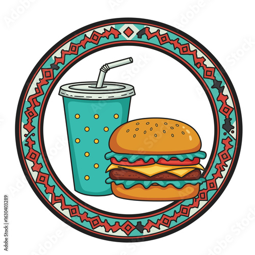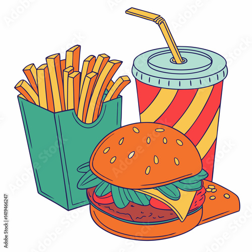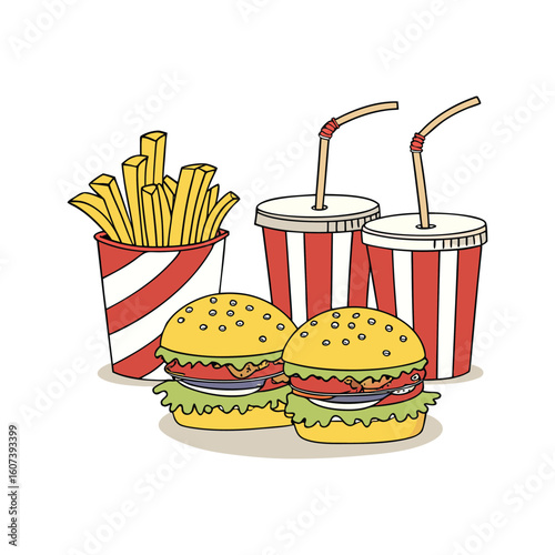 Fast food plakát v retro pop art stylu. Vektorové komiksové ilustrace. Koncept grafické pozadí s hamburger, hranolky a soda.
