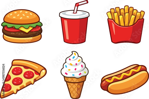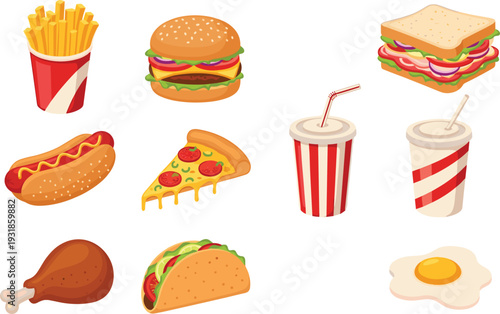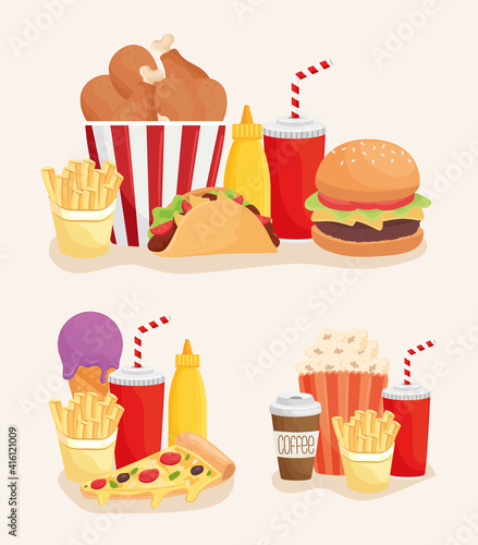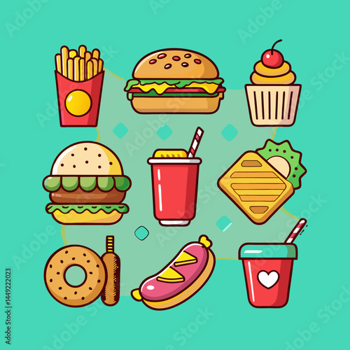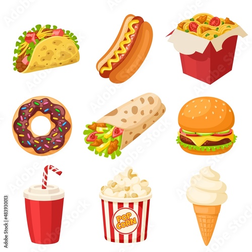 Fast food set, ploché vektorové izolované ilustrace. Burger, shawarma, hranolky, káva, párek v rohlíku, pizza, kuřecí stehna, popcorn, wok, kužel zmrzliny. Restaurace rychlého občerstvení cafe Bar menu.