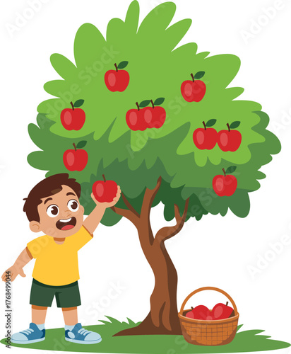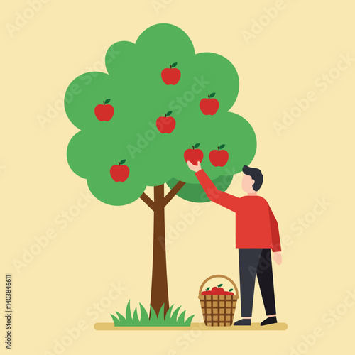 Otec a malý syn dítě vybírání apple fuits ze stromu vektorové ikony izolovaných na bílém pozadí.