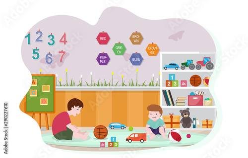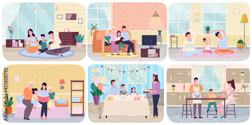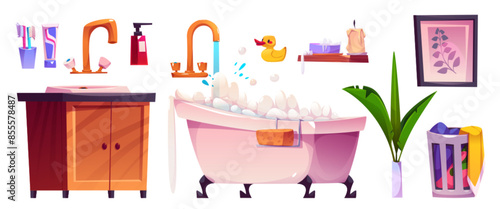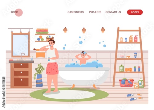 Otec a syn dělají ranní hygienickou rutinu společně v koupelně. Muž čištění zubů, chlapec koupání ve vaně. Koncept ilustrace. Vektor web design šablony. Webové stránky vstupní stránky.