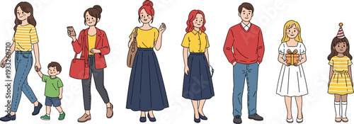 Ženské dospělé a děti orchestr března vektorové ilustrace. Roztomilý pochodující mladá žena a děti v červené uniformě hraní na hudební nástroj izolovaných na bílém pozadí