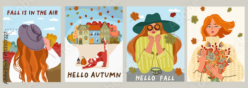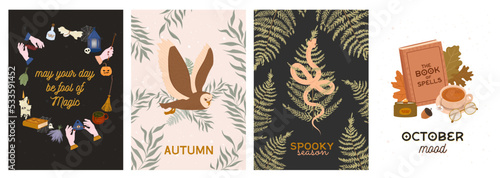 Žena věštkyně pomocí křišťálové koule předpovídat budoucnost. Věštění koncepce vektorové plakáty set. Tarotové karty, magické předměty a symboly, Věštění z ruky, astrologie, duchovní seance.