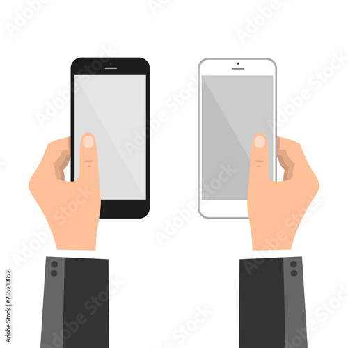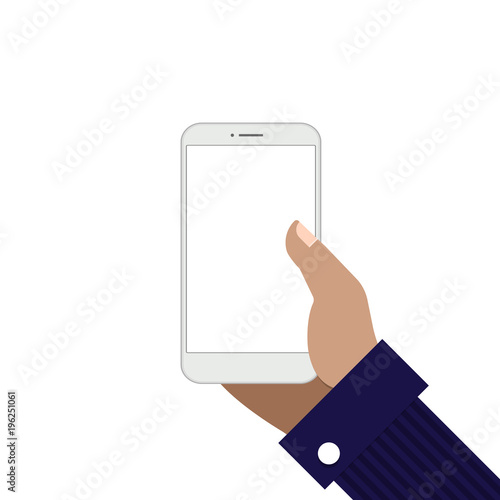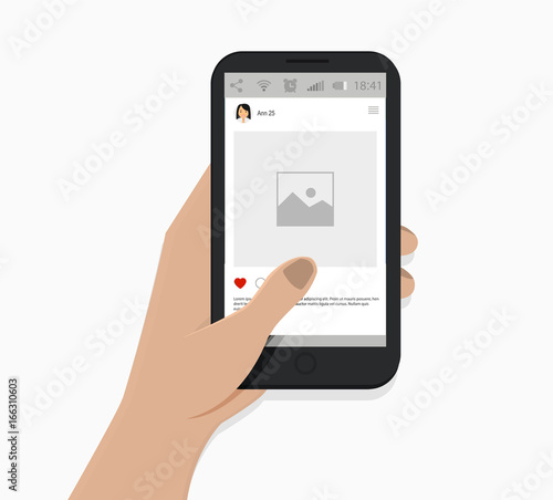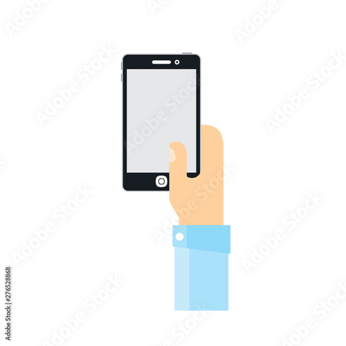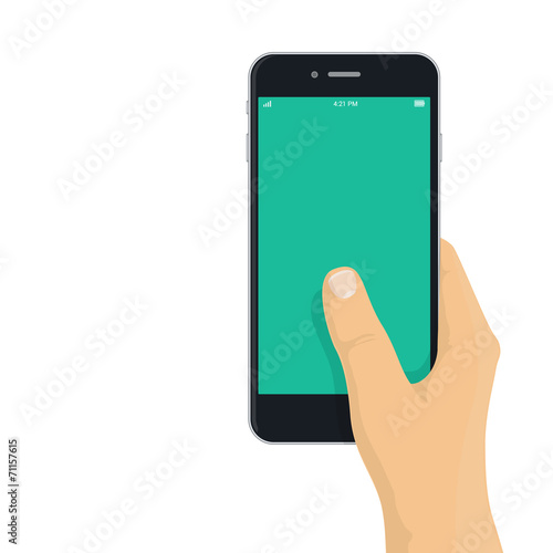 Žena ruka drží smartphone, ploché vektorové ilustrace. Ruční interakce s moderní vertikální maketou mobilního telefonu.