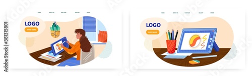Žena ilustrátor a grafik pracují z domova pomocí digitálního tabletu. Grafický design software a technologie koncepce ilustrace. Vektor web design šablony. Počítačový tablet na stole.