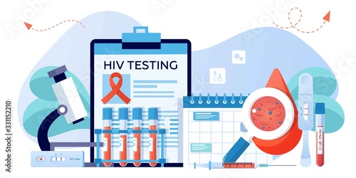 Vědkyně analyzující krev v laboratorním mikroskopu. Vektorová plochá ilustrace. Vědecký výzkum, laboratorní experiment, věda a vzdělávání. Studentka lékařské laboratoře.