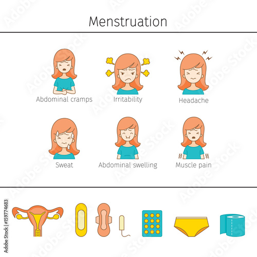 Příznaky hormonální nerovnováhy infographic. Kreslená ženská postava trpící menstruačními periodickými nebo menopauzálními změnami v vektorové ilustraci těla. Koncept zdraví a medicíny ženy