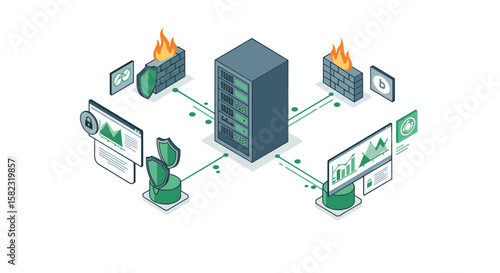 Vývojový diagram hostování souborů, vektorové ilustrace. Izometrické serverové regály, uživatelská složka, počítač, e-mail, cloudové úložiště. Internetová hostingová služba. Platforma pro sdílení souborů.