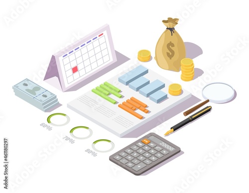 Koncept finanční správy ploché vektorové izometrické ilustrace. Řízení financí, účetnictví, finanční výkaznictví, audit, kontrola rozpočtu.