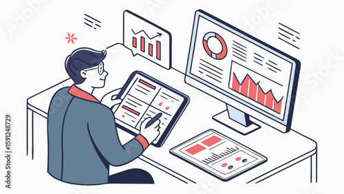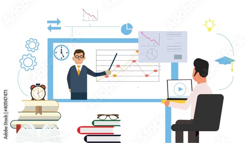 Investice do akcií třídy, školení, ploché vektorové izometrické ilustrace. Mobilní učení. Seminář. Online finanční investice, koncept kurzů obchodování s akciemi.