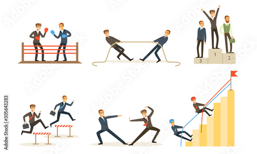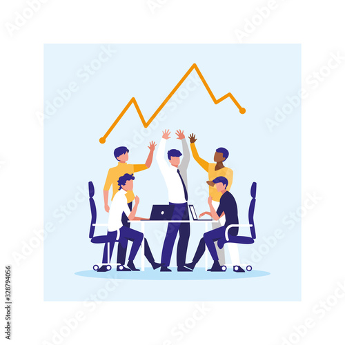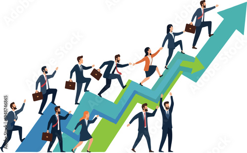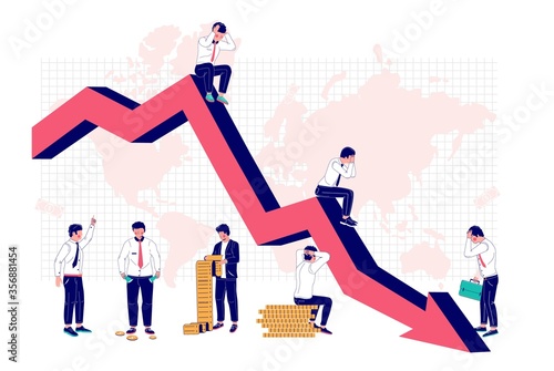 Šipka dolů a podnikatelé, kteří mají problémy s penězi, vektorové ploché ilustrace. Obchodní selhání, selhání investic, nezaplacené účty a dluhy z půjček, finanční problémy.