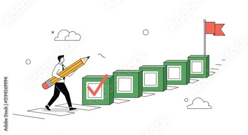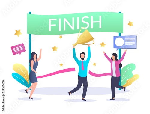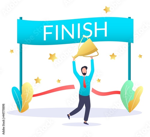 Obchodní muž křížení cílovou čáru s trofej pohár ve zvednutých rukou, ploché vektorové ilustrace. Šťastný podnikatel slaví vítězství, gólové úspěchy. Dokončit obchodní dohodu, vedení, Kariérní koncept.