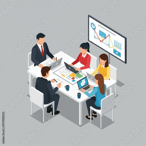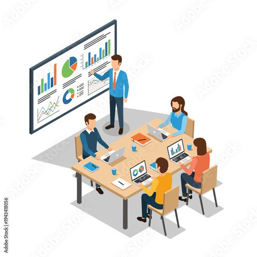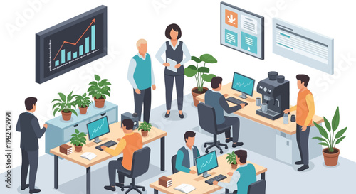 Vektorové izometrické ilustrace multietnické skupiny kancelářských pracovníků, kteří jsou propuštěni ze své práce zaměstnavatelem a směřují je ke dveřím.