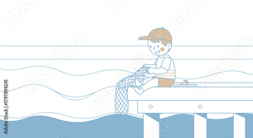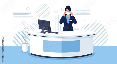Obchod s rybami, ploché vektorové ilustrace. Prodavačka stojící u pultu lednice s čerstvými a konzervovanými rybami. Obchod s rybami, trh. Supermarket, obchod s potravinami seafood sekce, oddělení.