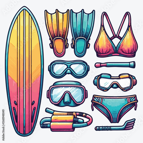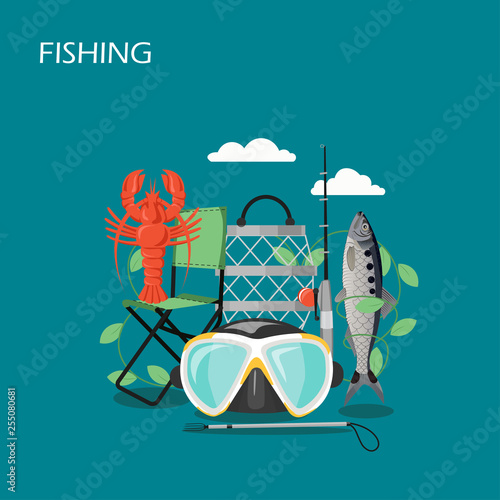 Rybaření vektor plochý styl designu ilustrace. Rybářský prut, Harpuna, maska, židle, ryby, humr. Zařízení a zásoby pro lov ryb a raků pro webový banner, webovou stránku atd.