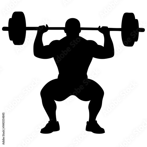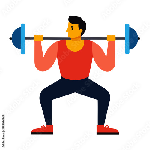 Kulturista dělá zadní dřepy s činkou, vektorová plochá ilustrace izolovaná na bílém pozadí. Vzpírání, silový trénink, čerpací žehlička, sportovní aktivita, cvičení v tělocvičně, cvičení na váze.