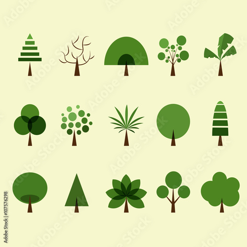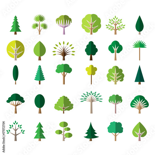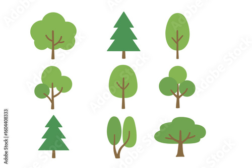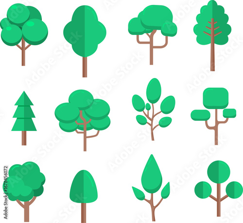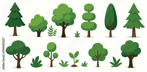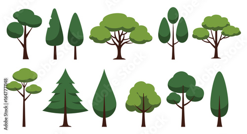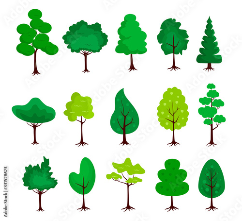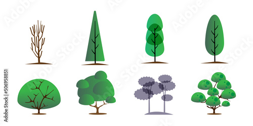 Plochý stromový set izolovaný na bílém pozadí. Vektorová sbírka designových prvků pro hry, karikatury, ilustrace.