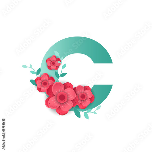 Květinová abeceda, vektorové ilustrace v papírovém uměleckém stylu. A, B, C, D anglická abeceda velká písmena s krásnými exotickými tropickými listy a květy.
