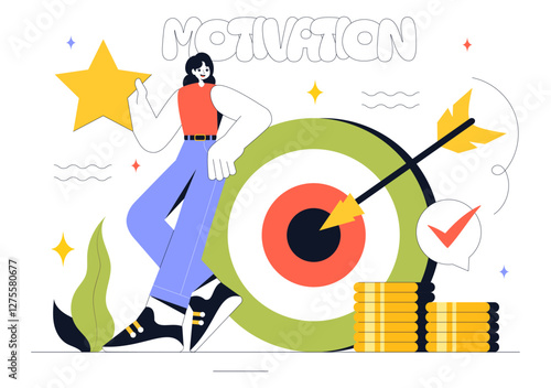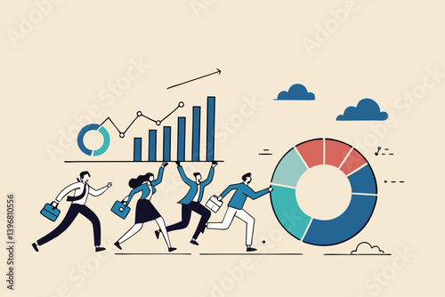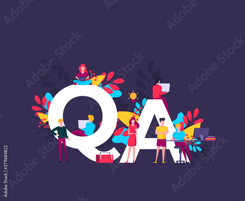 Jídlo velkými písmeny, mužské postavy nakupující s taškami na potraviny, číšník v restauraci s talířem na nádobí, kuchařka s pánví, vektorová plochá ilustrace. Lidé nakupují, servírují, připravují potraviny.