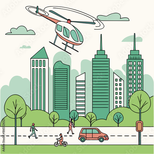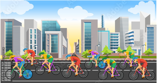 Vektorové ilustrace bicycle messenger dodávající lepenkovou krabici s rychlým občerstvením na kole a kurýrem procházejícím po ulici s červenou dodací taškou. Food delivery concept plochý styl designové prvky.