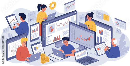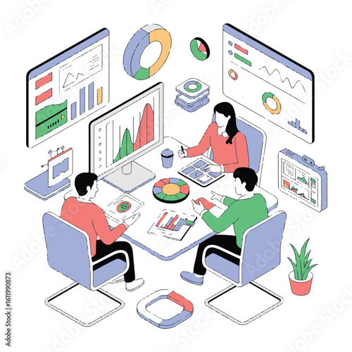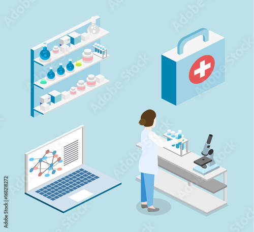 Potravinářský laboratorní výzkum izometrický vývojový diagram, vektorové ilustrace. Vědci, mužské a ženské postavy testování bezpečnosti a kvality potravinářských výrobků v laboratoři. Vědecké studium potravin.