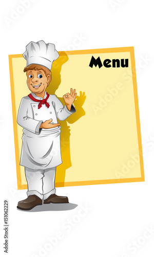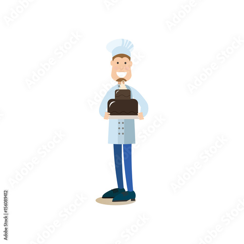 Vektorová ilustrace šťastného usmívajícího se kuchaře nebo kuchaře v uniformě držící talíř s hamburgerem. Food lidé plochý styl designový prvek, ikona izolován na bílém pozadí.