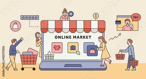 Obchod s potravinami, Farmářský trh vektorová šablona plakátu. Mužské a ženské postavy nakupují potraviny. Lidé s nákupním košíkem a vozíkem plným ovoce, zeleniny, dalších produktů, ploché ilustrace.