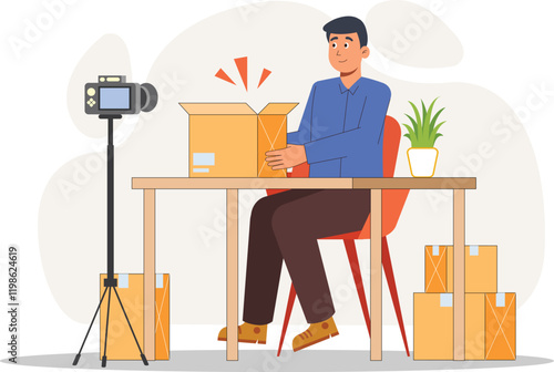 Food video blogger vaření a živé vysílání online. Žena kuchař ukazuje recept na kameru ve vlogu. Kurz vaření a video tutoriál. Vektorové ilustrace s kreslenou postavičkou. Domácí kuchyňské studio.