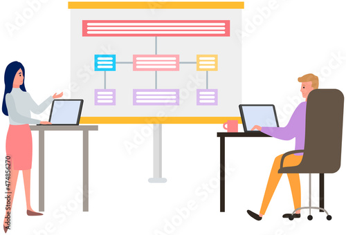 Muž na volné noze pomocí notebooku, zatímco sedí u stolu. Vektorová plochá ilustrace izolovaná na bílém pozadí. Umělecká tvorba, umělecký a kreativní koncept povolání pro webový banner, webovou stránku atd.