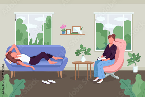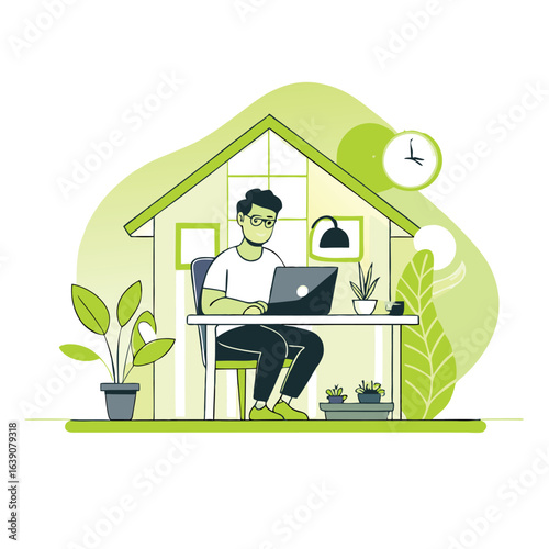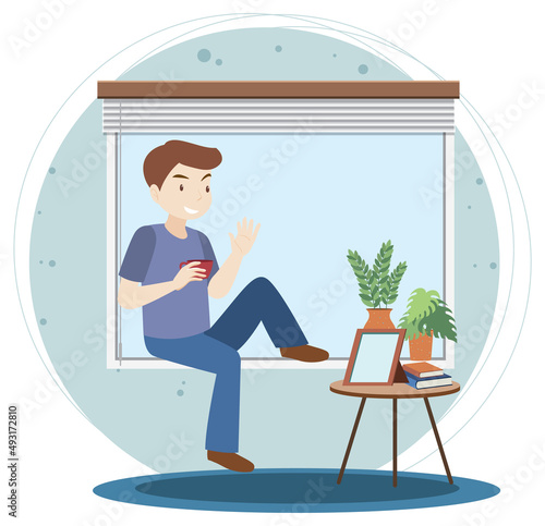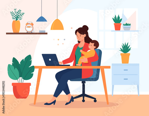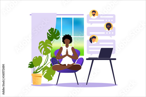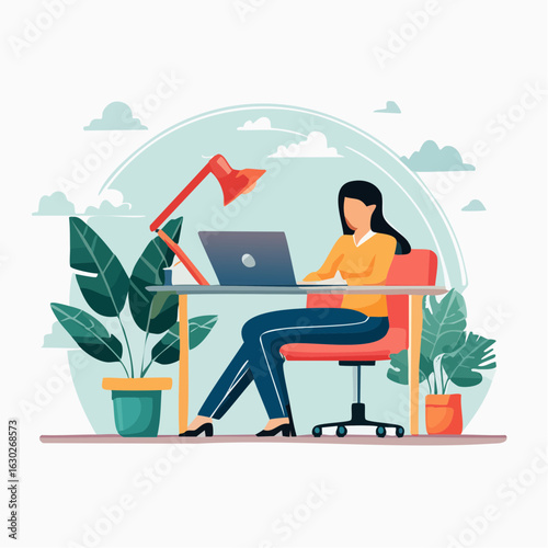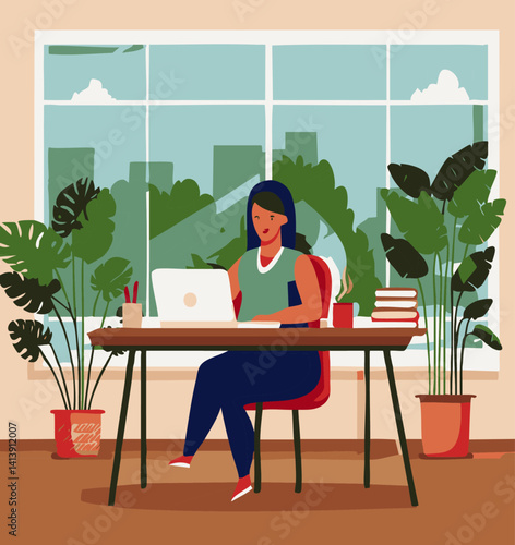 Noha. Mladá žena pracující z home office sedí s kočkou na parapetu, ploché vektorové ilustrace. Freelancer ženská postava pracuje na notebooku v obývacím pokoji. Práce na dálku, online učení.