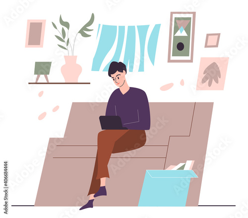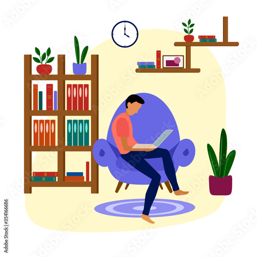 Mladý muž na volné noze pracuje na notebooku doma ležící v houpací síti, vektorová plochá ilustrace. Práce na dálku, na volné noze, domácí pracoviště.