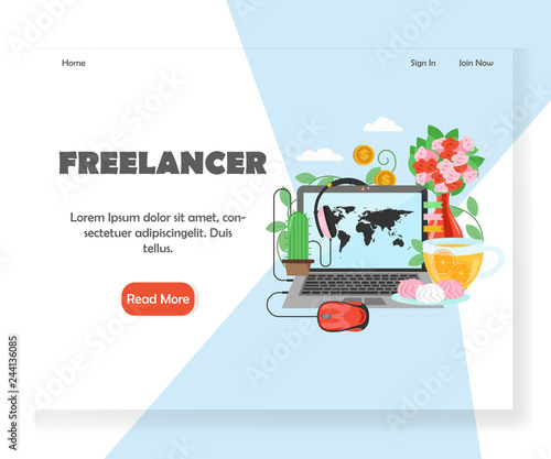 Šablona vstupní stránky na volné noze. Koncept designu vektorového plochého stylu pro webové stránky na volné noze, vývoj mobilních stránek. Pohodlné stylové domácí pracoviště s moderním vybavením, koncepty služeb na volné noze.