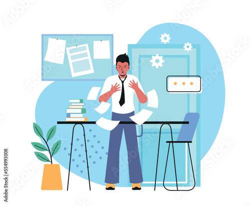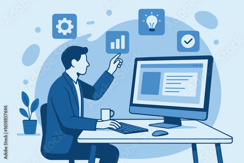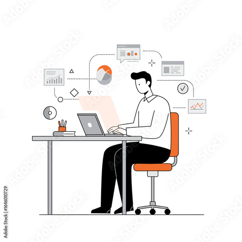 Mladý muž na volné noze sedí u stolu a pracuje na notebooku v domácí kanceláři, vektorová plochá ilustrace. Domácí pracovní prostor s deskou scrum. Práce na dálku, freelancing koncepty.