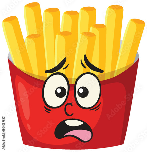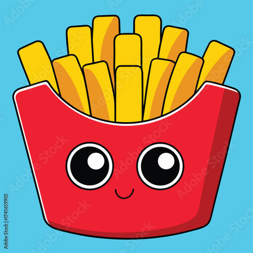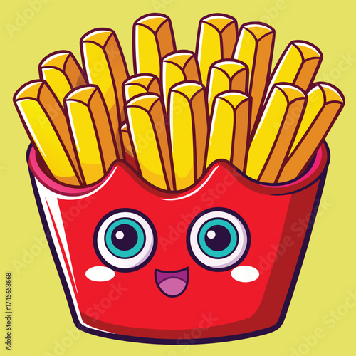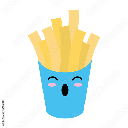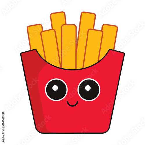 Hranolky brambor charakter kreslený vektor. Roztomilé rychlé občerstvení s legrační obličej maskot. Šťastný úsměv comic junk snack V stánek s jídlem krabici izolovaných na bílém pozadí