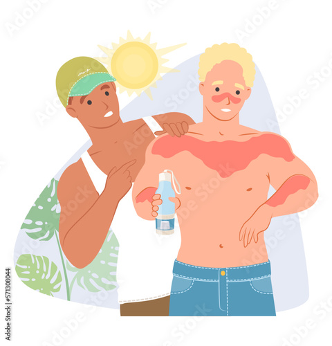 Spálení slunce vektor. Cartoon man pomáhá příteli s poškozenou pokožkou nanášení opalovacího krému na opalování a opalovacího krému s SPF. Péče o pleť a ochrana při opalování na pláži ilustrace