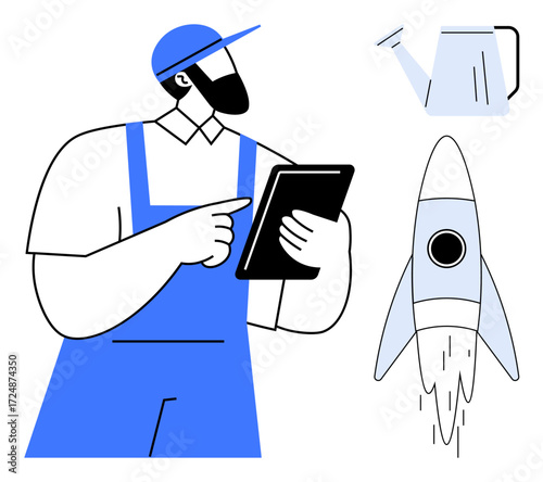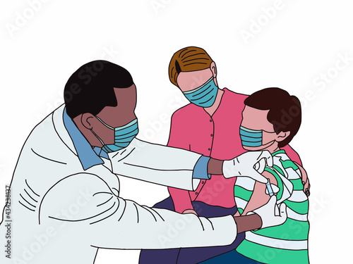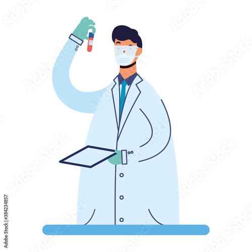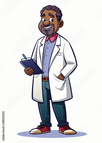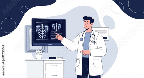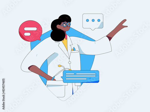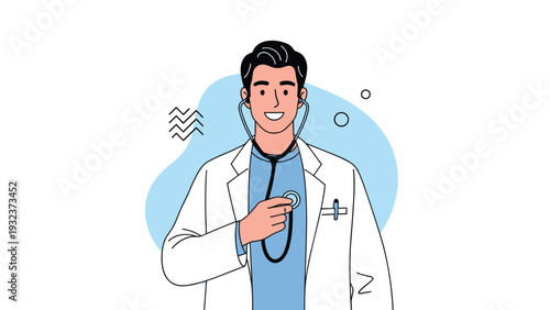 Přátelský usměvavý lékař mrknutí oka a ukázal stranou s oběma rukama vektorové ikony izolovaných na bílém pozadí