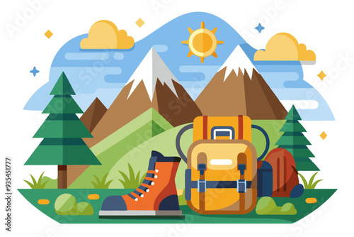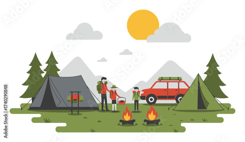 Přátelé v kempu vector. Lidé venku piknik v kempu na přírodu. Muž a žena přívěs karavan odpočinku na břehu řeky v lese. Cestování ve víkendové aktivitě ilustrace