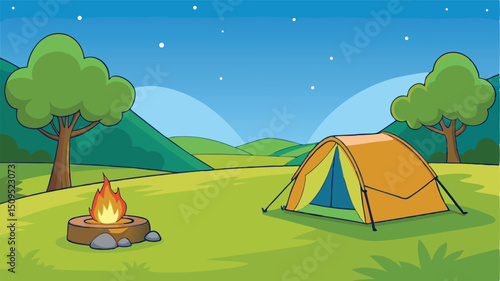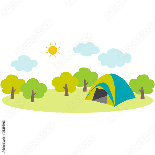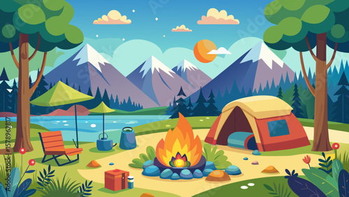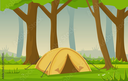 Přátelé tábor v lese vektorové ilustrace. Kreslený turistický letní kemp s odpočívajícími lidmi. Turistika v přírodě a horský kemp