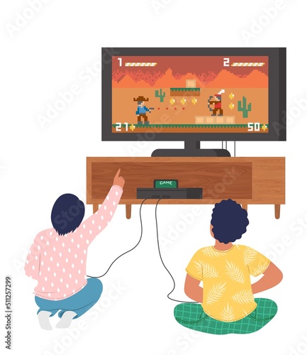 Přátelé hraní videohry vektorové ikony izolovaných na bílém pozadí