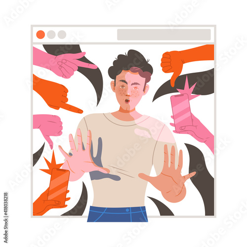 Vyděšený chlap při pohledu na obrazovku počítače pocit šoku ze zpráv viděl vektorové ikony izolované na bílém pozadí. Koncept virové pandemie.