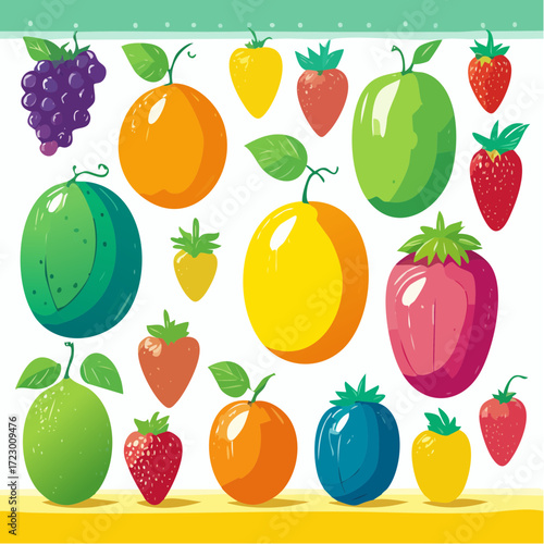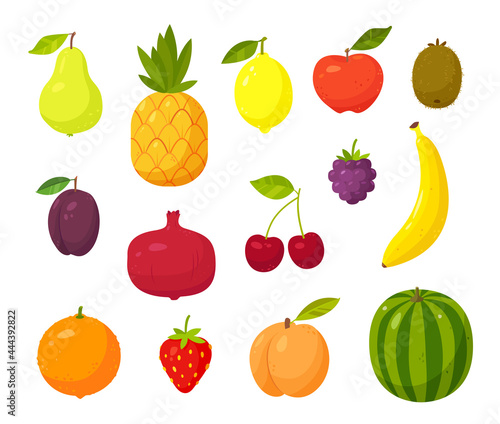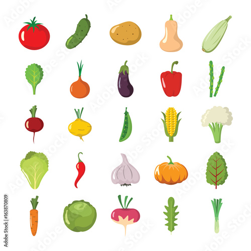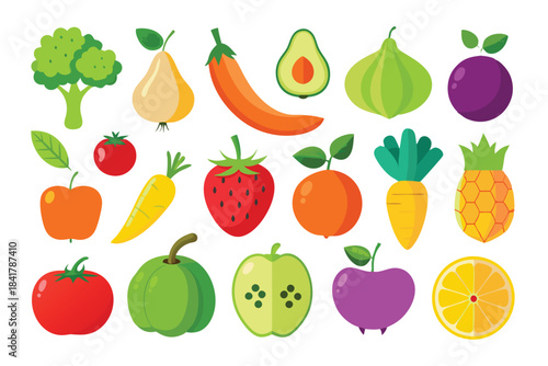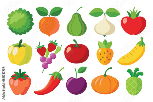 Ovoce a zelenina ikona set, ploché vektorové izolované ilustrace. Čerstvé organické vegetariánské potraviny, kreslený styl. Kedlubny, kukuřice, cibule, brokolice, mrkev, rajče, okurka, avokádo jablko hruška citron atd.