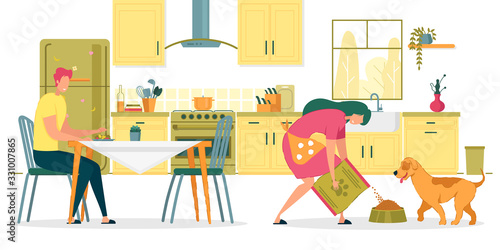 Šváb v domácí kuchyni vektor. Funny cartoon bug škůdce špinavá postava baví, jíst lidské jídlo zbytky ilustrace. Insect havmin living at people house vnitřní pozadí