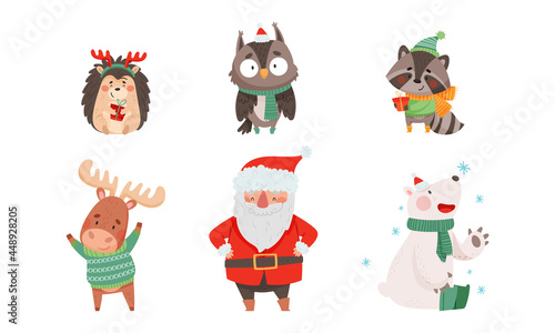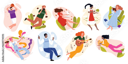 Legrační doodle lamas alpacas ploché vektorové sady. Roztomilé divoké zvíře na koni kolo, sedí na dárek boa a plovoucí jako úhel ilustrace izolovaných na bílém pozadí