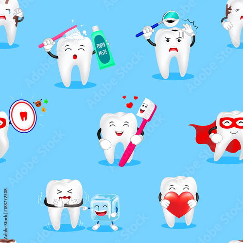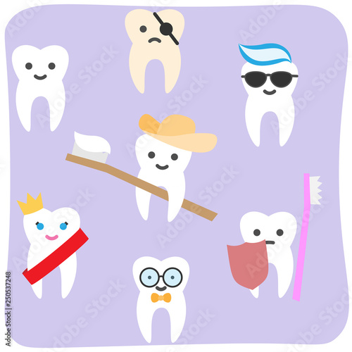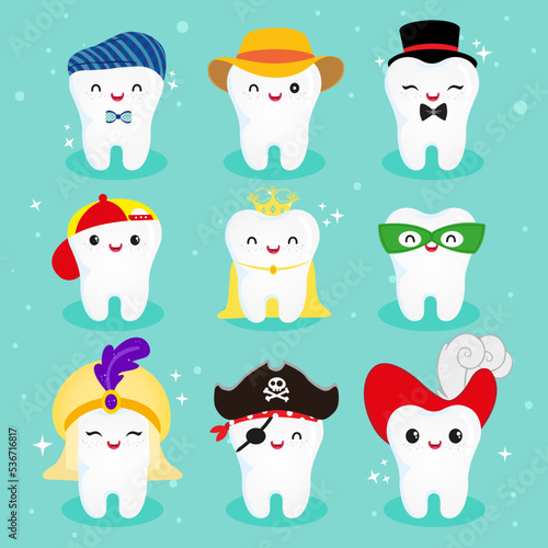 Legrační zub kreslená postavička sada, ploché vektorové izolované ilustrace. Šťastné zdravé a smutné nezdravé zuby s lidskými tvářemi. Zubní maskot, emoji, úsměv, emotikon super hrdiny. Dětská stomatologie.