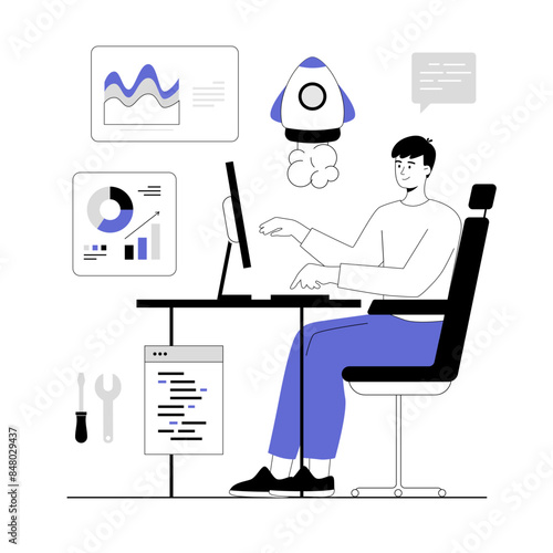 Návrhář nábytku vytváří nábytek sedící u stolu před počítačem, vektorové ploché izometrické ilustrace. Výrobce nábytku navrhující šatní skříň pro výrobce. Kreativní designérské pracoviště.