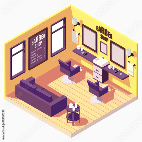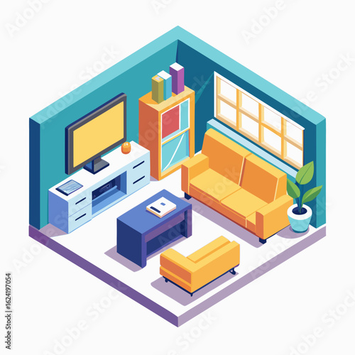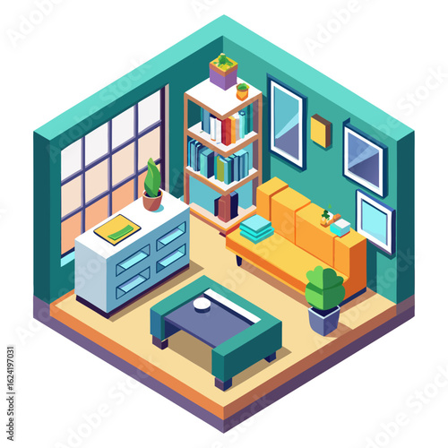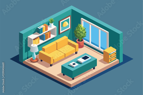 Koncepce instalace nábytku. Vektorový izometrický výřez interiér obývacího pokoje s pracovníkem tesař instalace dřevěné dvou zásuvkové skříně.