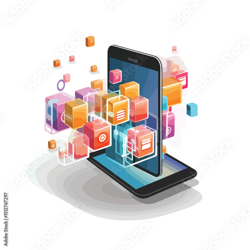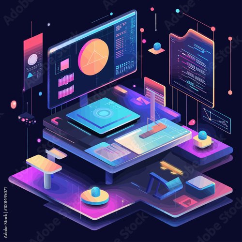 Futuristická technologie AI a notebook hologram vektorové 3D ilustrace. Umělá inteligence interaktivní tech interakce, inteligentní strojní mozek pracující na tvorbě a komunikaci